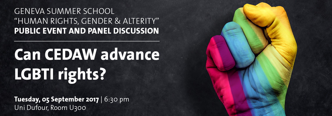 “10 years after the Yogyakarta Principles and one year after the appointment of the first ever UN expert on sexual orientation and gender, how are LGBTI rights protected internationally? This panel will examine the scope of action for the development of these rights on an international level and the role of CEDAW in achieving a better protection. What strategies do associations like ILGA use for the promotion of LGBTI rights? What role does CEDAW play in this context? And finally, how can LGBTI rights be advanced while being sensitive to power relations in the postcolonial context? This public panel discussion is organised in the context of the Geneva Summer School on Human Rights, Gender and Alterity”.